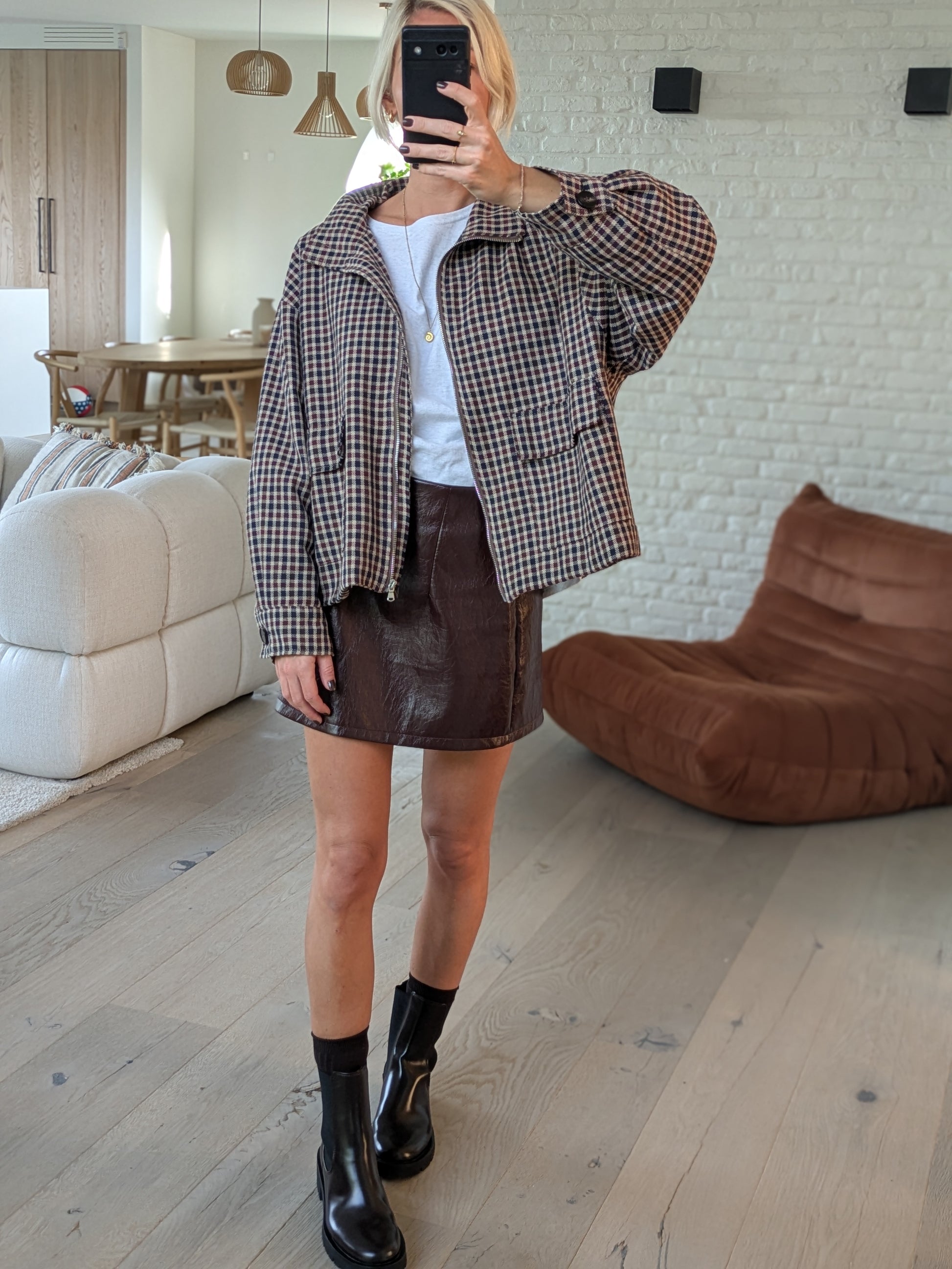 Check burgundy jacket