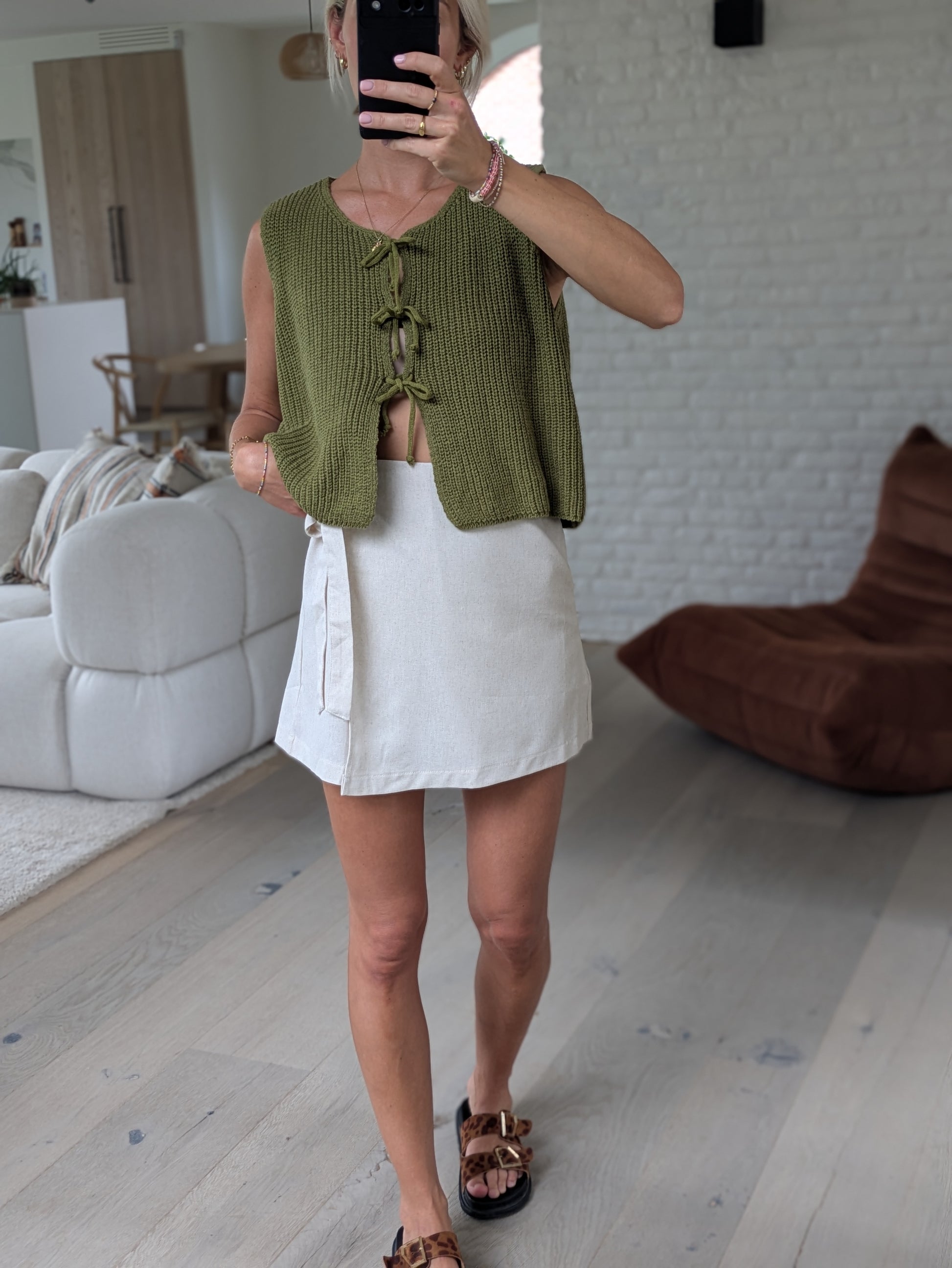 Zomers topje met touwtjes die aangetrokken kunnen worden. Tailleert TU, maar wij raden hem aan voor de maatjes 34-40.